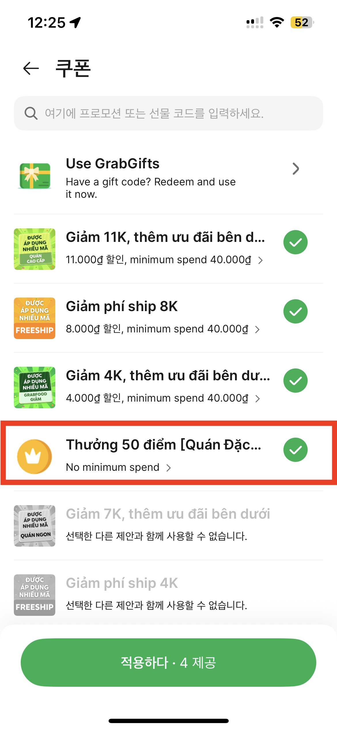 2. 그 외에 내가 사용 가능한 쿠폰이 있는데, 가장 높은 쿠폰 순서대로 누르면 됨. 이리저리 눌러보면 사용 가능한 최대치가 눈에 보임. 쓸 수 있는 만큼 다 쓸 수 있음. 배달비는 안 내고 배달시킬 수 있다는 거! 아래에 보이는 건 그랩 자체에서 주는 쿠폰 같음. 일정 금액 이상을 시키면 쿠폰이 보임.