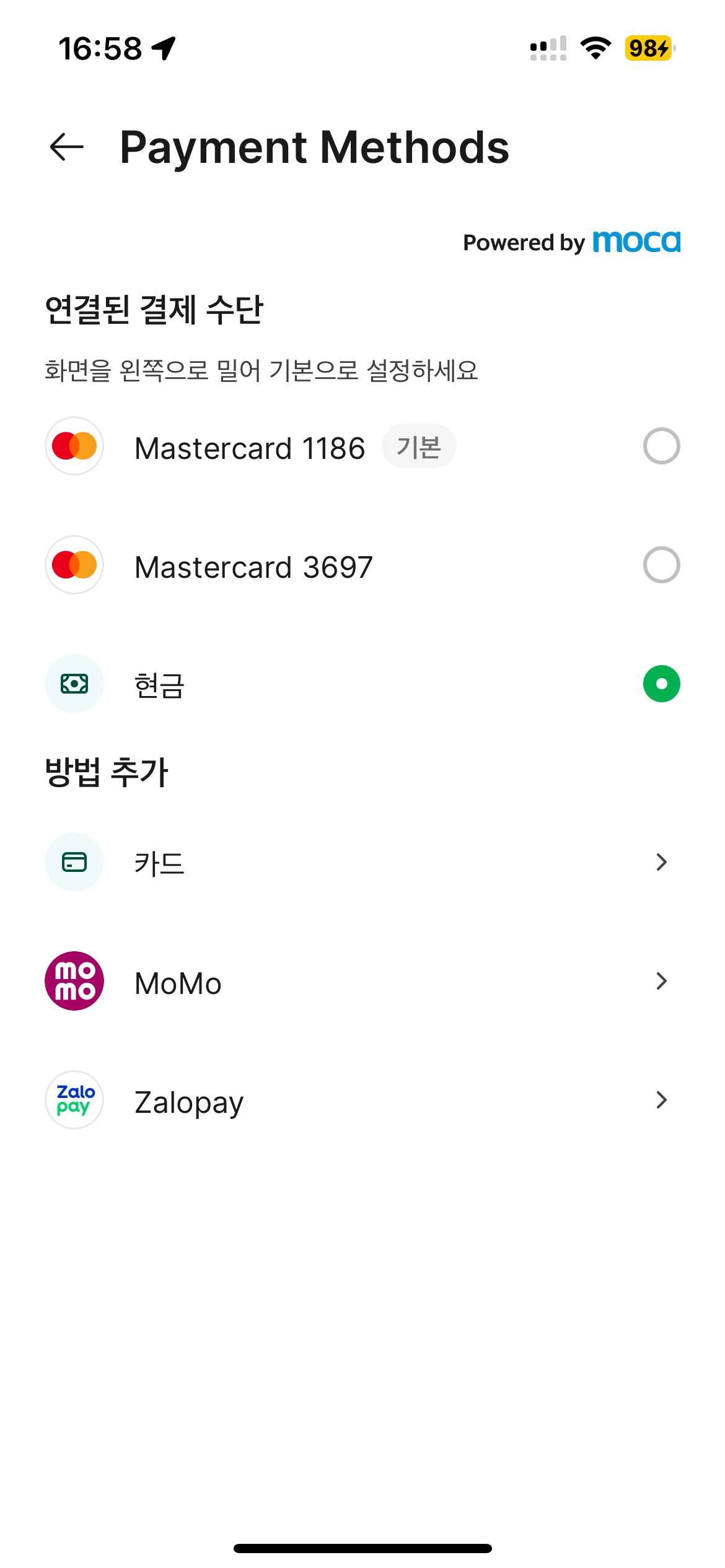 - 결제 세부 정보 > see all > 현금 선택!