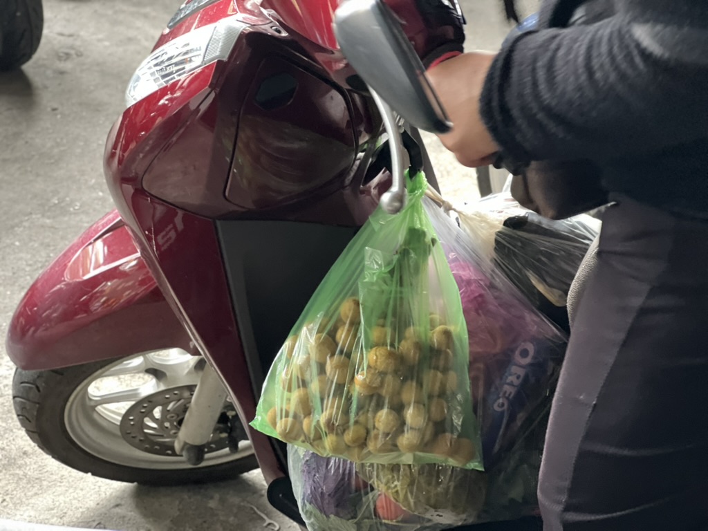 장보면 나보고 다 들라고 하는데 저게 생각보다 진짜 무거웠다. 다음에는 장바구니 가져가야 하나 고민 할 정도. 사람이 많으면 택시를 타고 오라고 하는데, 하는 혼자여서 셰프 오토바이 뒷자석에 앉아서 편하게 왔다. 이제 만드는 일만 남았다.