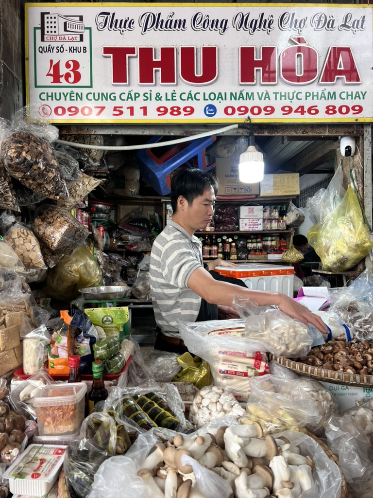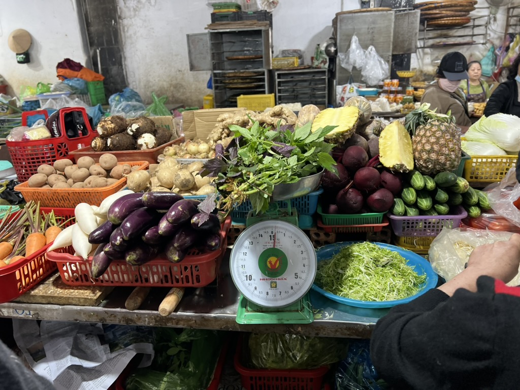 달랏 전통시장 채소 코너로 셰프가 온갖 채소를 설명해준다. 가게들은 정말 많은데 셰프가 가는 곳들은 다 재료가 신선하고 가격도 괜찮았다. 베트남 채소의 장점은 향이 강하고 좋다는 것. 향신료를 좋아하는 나로서는 여기는 천국이었다. 향을 담아올 수 있다면 기억할 수 있다면 얼마나 좋을까. 무게로 금액을 재는데 역시나 싸다. 마트보다 신선해보이는데 싸다니. 조금만 발품팔면 시장에서 가장 가성비 있는 장을 볼 수 있다.