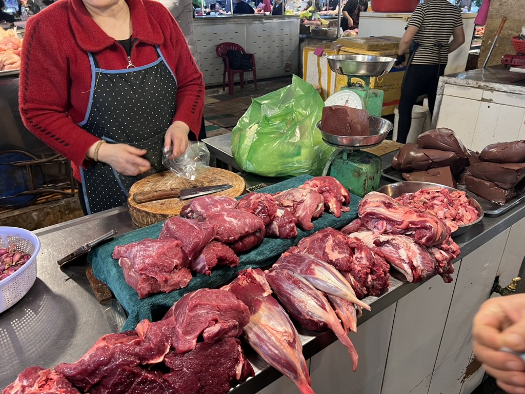 우리나라도 닭발 이런거 먹지만 여긴 난생 처음 보는 신비한 것들이 많다. 가장 평범하게 생긴게 그나마 새우였다. 오리부터, 닭머리, 돼지, 소머리, 가죽을 그대로 벗겨놓은 토막난 고기들.. 그 사이에 서 있는 나와 옆에 바구니에서는 두꺼비 (절대 개구리 아니고 두꺼비)가 나오고 싶어서 사정없이 바구니를 흔드는 모습을 볼 수 있다.